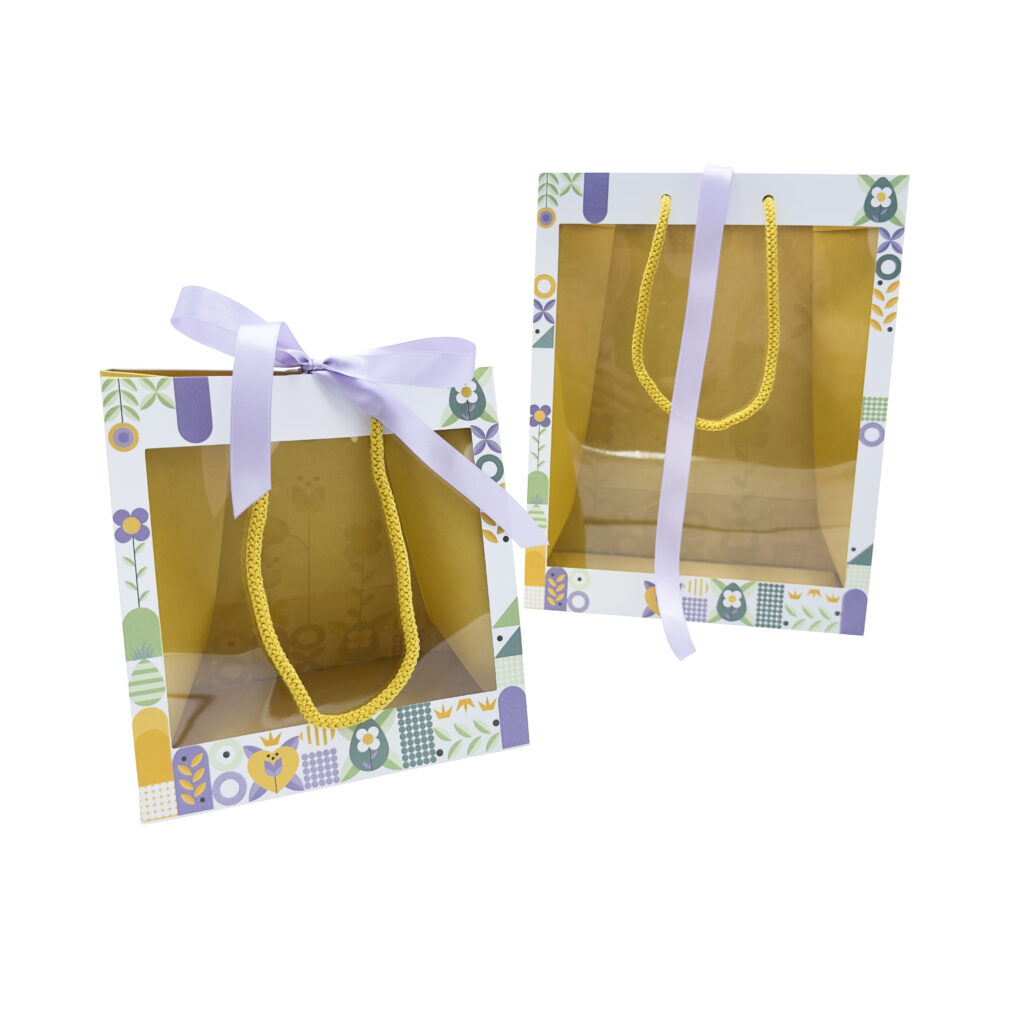 Sac à Fenêtre pour moulage Cache Cache Emballez vos moulages de Pâques dans l’une de nos 2 tailles de sacs à Fenêtre ! Doté d’un ruban pour fermer le sac et de cordelettes pour faciliter le transport. Disponible au décor de notre collection de Pâques Cache cache. Et pour un effet de gamme garanti, optez pour nos autres produits collection (boîte avec et sans fenêtre, faux fond, bague sachet etc). Avec sa large fenêtre, vous donnerez une bonne visibilité à vos chocolats et susciterez l’envie à vos clients ! Disponible sur stock. Dimensions 18 + 12 x 19 cm 22 + 12 x 28 cm 18 + 12 x 19 cm 22 + 12 x 28 cm Specs StockFenêtreChocolatVisibilitéTransparencePâques