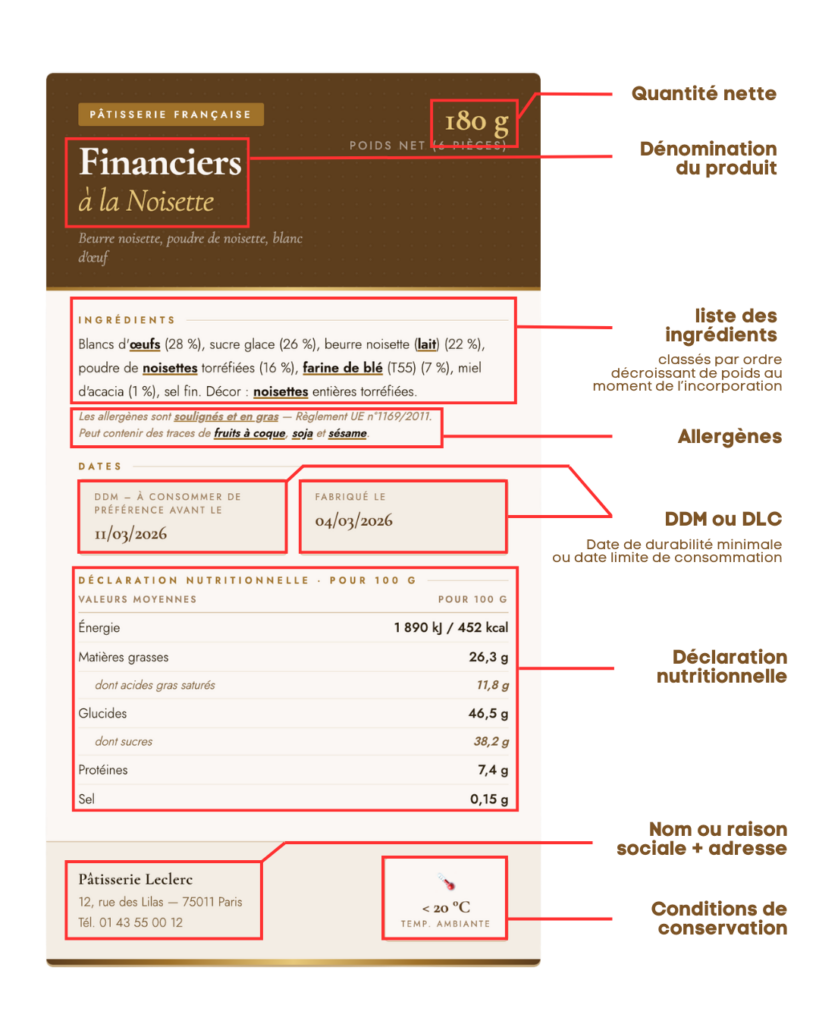 Actualités Règlement INCO : ce que chaque artisan doit savoir sur l’étiquetage de ses produits Boulangers, pâtissiers, chocolatiers, confiseurs • Votre guide complet pour une mise en conformité sereine. En tant qu’artisan des métiers de bouche, vous mettez tout votre savoir-faire dans chaque création. Mais au-delà du goût et du visuel, la réglementation vous impose également de délivrer une information claire, précise et loyale à vos clients • c’est précisément l’objet du règlement INCO. Comprendre ce texte, c’est protéger votre clientèle, sécuriser votre activité et valoriser votre professionnalisme. Qu’est-ce que le règlement INCO ? Le règlement (UE) n°1169/2011, communément appelé règlement INCO (Information des Consommateurs sur les denrées alimentaires), est le texte européen de référence en matière d’étiquetage alimentaire. En vigueur depuis le 13 décembre 2014, il remplace et unifie les anciens textes nationaux pour instaurer des règles communes à l’ensemble des États membres. Son objectif est double : garantir que les consommateurs disposent d’informations fiables pour faire des choix éclairés, et créer un cadre équitable pour tous les acteurs de la filière alimentaire • des industriels jusqu’aux artisans de proximité comme vous. 📌 À savoirLe règlement INCO s’applique aussi bien aux produits préemballés qu’aux produits non préemballés. En boulangerie-pâtisserie, cela concerne donc à la fois vos boîtes de gâteaux vendues emballées et vos pièces présentées directement en vitrine. Les mentions obligatoires pour les produits préemballés Un produit est dit préemballé dès lors qu’il est conditionné avant la vente dans un emballage qui le recouvre intégralement ou en partie, de façon que son contenu ne puisse être modifié sans ouvrir ou changer cet emballage. Vos boîtes de macarons, vos coffrets de chocolats, vos sachets de viennoiseries : tous entrent dans cette catégorie. Pour ces produits, huit informations sont rendues obligatoires par le règlement INCO : 1. La dénomination du produit Elle doit être claire, précise et non équivoque. « Tarte citron meringuée » est correct ; « Gâteau de chez nous » ne l’est pas. Si la dénomination légale d’un produit existe (comme « pain au chocolat » ou « croissant »), elle doit être utilisée. 2. La liste des ingrédients Tous les ingrédients doivent être mentionnés, classés par ordre décroissant de poids au moment de leur incorporation dans la recette. N’oubliez pas les additifs (conservateurs, colorants, émulsifiants), les auxiliaires technologiques et les solvants d’extraction. 3. La mise en évidence des allergènes C’est l’un des points les plus critiques : les allergènes présents dans la liste des ingrédients doivent être mis en évidence par une typographie distincte • gras, italique, majuscules, ou toute combinaison permettant de les identifier instantanément. Voir notre section dédiée ci-dessous. 4. La quantité nette Le poids ou le volume total du produit, exprimé en unités légales (grammes, kilogrammes, millilitres, litres). Pour les produits vendus à la pièce, la mention du nombre peut suffire. 5. La date de durabilité (DDM ou DLC) La Date de Durabilité Minimale (DDM), mentionnée sous la forme « À consommer de préférence avant le… », concerne les produits stables (biscuits, chocolats conservés…). La Date Limite de Consommation (DLC), notée « À consommer jusqu’au… », s’applique aux produits microbiologiquement périssables (entremets frais, crèmes pâtissières…). 6. Les conditions de conservation Lorsqu’une conservation particulière est nécessaire (« À conserver entre 4°C et 8°C », « À l’abri de la lumière et de l’humidité »…), la mention est obligatoire. Elle peut figurer avec la DLC. 7. Le nom et l’adresse du responsable Nom ou raison sociale et adresse du fabricant, du conditionneur ou du distributeur établi dans l’Union européenne. Pour un artisan en vente directe, c’est votre nom et l’adresse de votre atelier. 8. La déclaration nutritionnelle Obligatoire pour les produits préemballés, elle doit indiquer au minimum la valeur énergétique et les teneurs en graisses, acides gras saturés, glucides, sucres, protéines et sel. Attention toutefois : des dérogations existent pour certains artisans, notamment en circuit court ou pour les petites structures / renseignez-vous auprès de votre chambre des métiers. 🎁 La solution LEBHAR pour les produits préemballésPour habiller vos créations en toute conformité, LEBHAR propose une gamme complète d’emballages personnalisés pour les métiers de bouche / boîtes à gâteaux, coffrets chocolats, sacs pâtissiers / conçus pour accueillir votre étiquette réglementaire dans les meilleures conditions. Et pour les produits non préemballés ? En boutique, une grande partie de vos produits est présentée à la vente directe, sans emballage préalable : les pièces en vitrine, les viennoiseries dans leur panier, les chocolats au comptoir. Pour ces produits, les obligations sont allégées mais réelles. Deux informations sont impérativement requises : La dénomination du produit, affichée à proximité immédiate (petite étiquette sur la vitrine, ardoise, fiche produit…) L’information sur les allergènes, accessible en boutique. Elle peut prendre la forme d’un affichage visible ou d’une mention du type « Liste des allergènes disponible sur demande », à condition qu’un renseignement immédiat soit effectivement possible. En pratique, les professionnels optent souvent pour une fiche récapitulative affichée derrière la caisse ou un classeur disponible à la demande, complété d’une mention générale visible. L’essentiel est que l’information soit accessible sans délai. Les allergènes : votre priorité absolue La gestion des allergènes est certainement